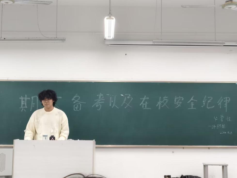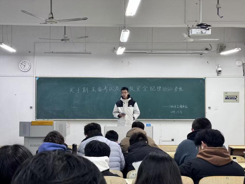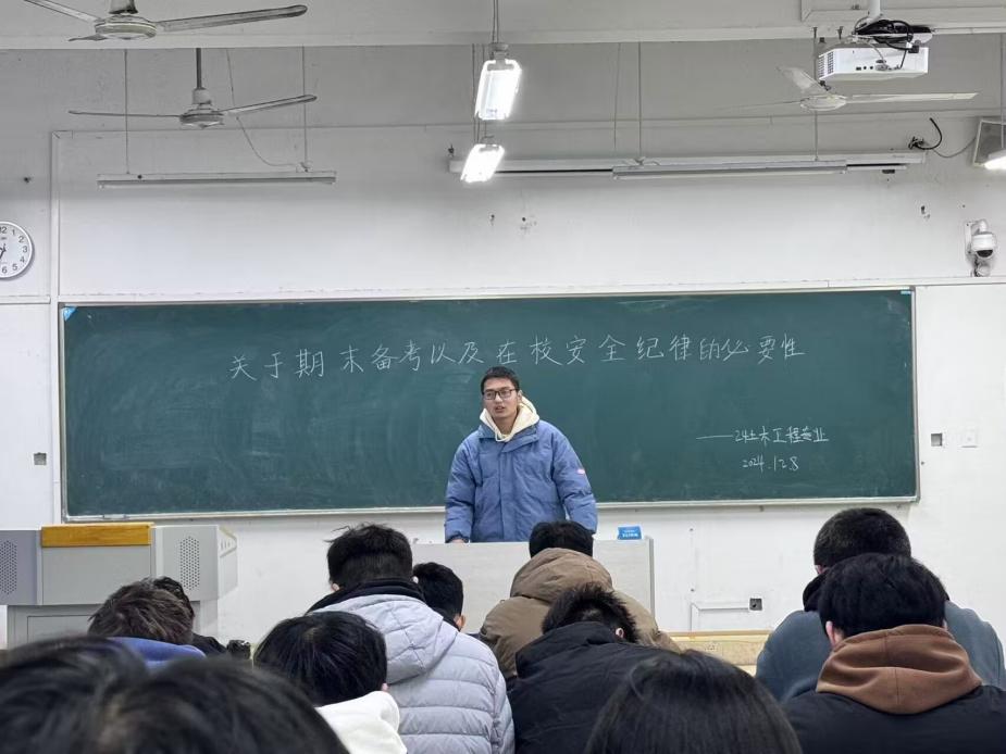 为做好期末备考,强化诚信考试意识,营造良好的校园环境,辅导员崔延组织24级无机非金属材料工程专业,24级土木工程专业,24级建筑环境与能源应用工程专业于2024年12月9日晚,分别在东教各专业教室举行了“踏实备考、诚信应考及校园安全”主题班会。