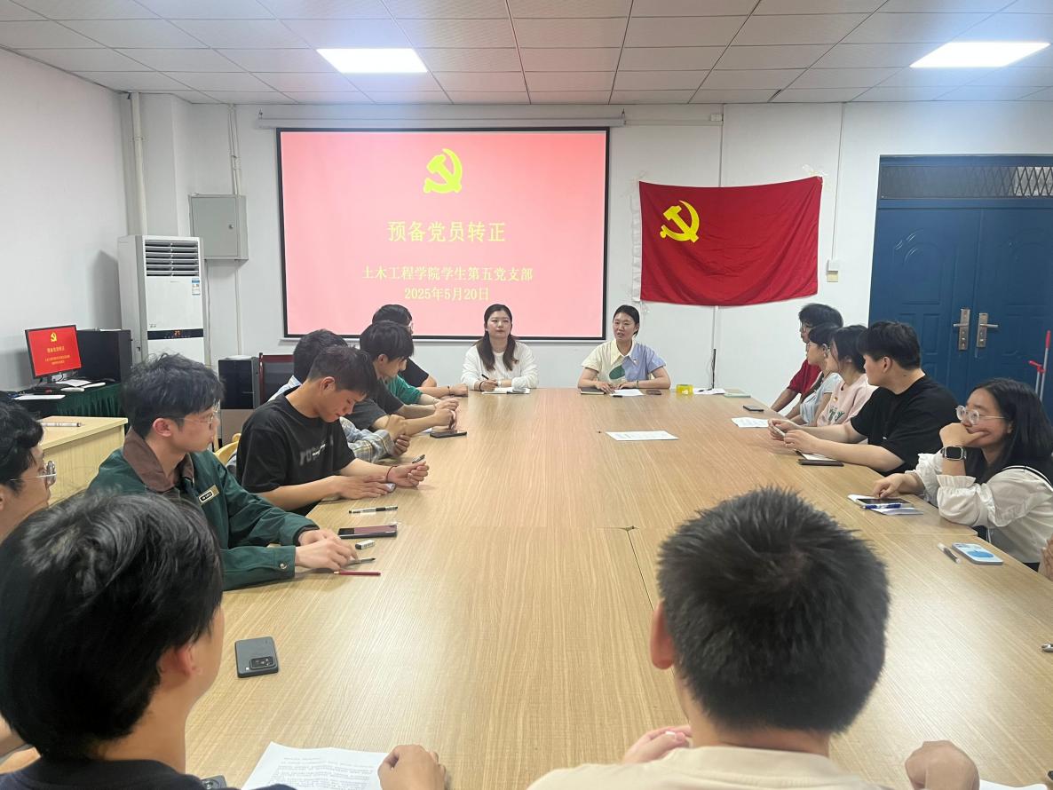 5月20日下午,土木工程学院学生第五党支部在实验楼北202会议室召开预备党员转正大会,讨论刘育馨等六名同志的转正问题。支部书记毛蕾同志主持会议,支部全体党员参加,会议在庄严的国歌声中拉开帷幕。