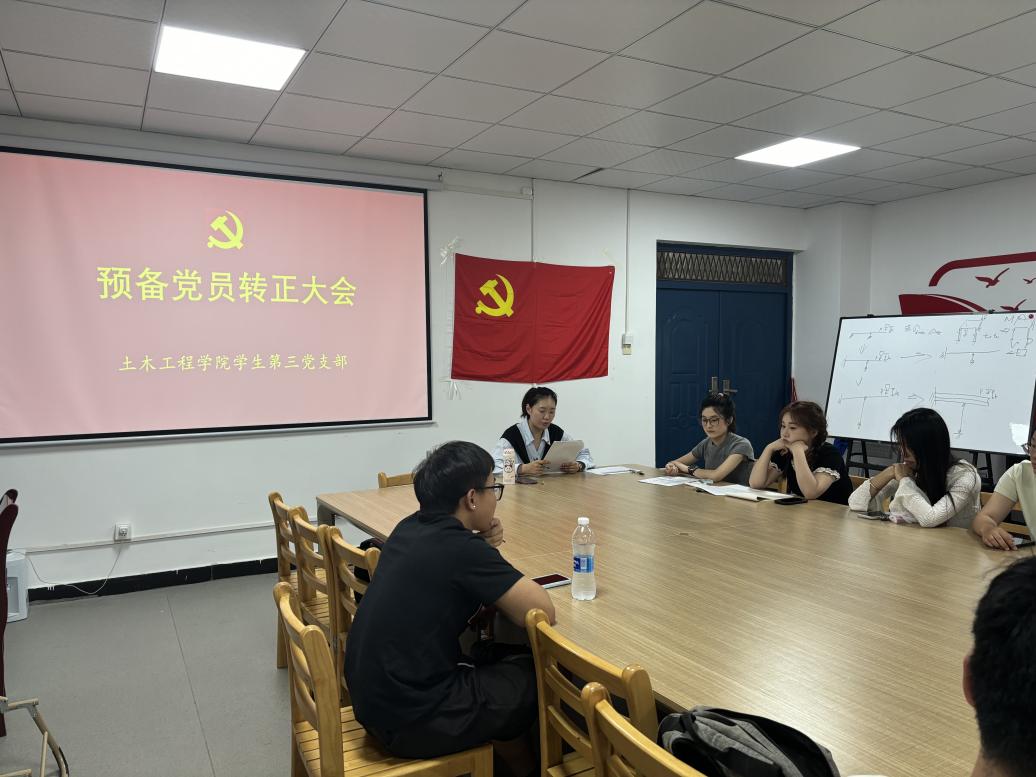 5月26日,土木工程学院学生第三党支部在实验楼北202召开了预备党员转正大会。此次会议由支部书记李梦雨主持,全体支部党员出席。会议主要围绕彭乐、李小蝶等五位预备党员的转正事宜展开讨论。