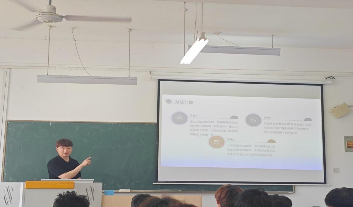 张经纬以肥东的地震为引,从地震成因,抗震设防烈度相关要求,地震作用计算位移要点等方面解释工程上的抗震措施。再引入一些理论知识,如力法计算,位移法计算等。讲到容易忽略的重点还会引用个人经历激起学生的兴趣,结合个人丰富的工程实践经历,深入浅出的进行解说,同学们兴趣盎然。当讲到力法计算时,详细阐释了力法的定义,即以广义力为未知量求解超静定结构问题,由于超静定结构具有多余约束,其广义未知力不能单由平衡条件求出,需要考虑实际荷载产生的位移和虚设单位力时产生的位移。同时,还介绍了力法计算的首要步骤——确定超静定次数,选取基本体系,帮助同学们了解基本理论框架。