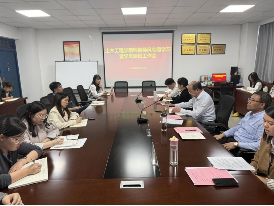 为进一步强化师德师风建设,扎实推进优良学风,2025年10月16日下午3时,土木工程学院在实验楼北302会议室召开师德师风专题教育暨学风建设工作会议。分管校领导李义宝出席并讲话,学院班子成员、专业带头人、全体教职工共同参会。会议由院长雷庆关主持。