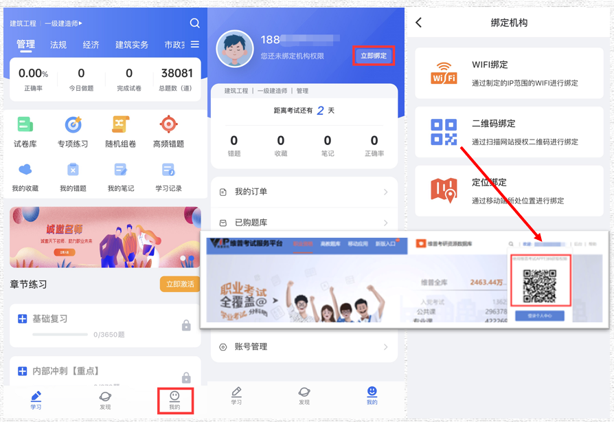 在机构IP范围外注册的无机构权限的个人账号,可以在机构IP范围内通过“维普考试”APP(各大应用市场可直接搜索下载)登录连接WIFI来绑定机构权限(推荐);或是通过“维普考试”APP扫描机构授权二维码(用户在机构IP范围内打开平台官网,机构授权二维码会显示在首页右上角的机构名称下)来实现机构绑定。