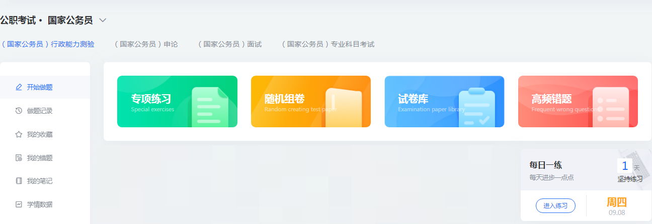 刷题中心 独立的刷题中心聚能平台所有的学习功能,有章节练习、专项练习、随机组卷、每日一练、历年真题、模拟试卷、冲刺密卷、高频错题、试题检索、试卷检索等,还可查询用户所有的学习记录,如做题记录、试卷记录、我的错题、我的收藏、我的笔记、学情数据等,记录分析用户的学习数据,为用户提供全方位的考试应用服务。