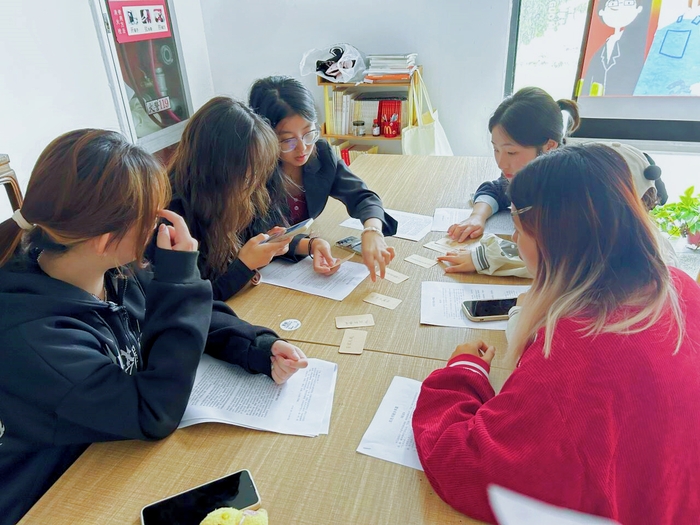领读员围绕《红岩》、《红星闪耀中国》等红色经典书籍和参与活动的同学一起进行读书分享。现场气氛热烈同学们畅所欲言,积极分享自己知道的相关红色经典和自己家乡的红色故事以及近期国庆热点话题。活动中同学们还在现场随机组成小组,在热火朝天的讨论声中,互相配合、团结协作将历史事件卡片按序排放。