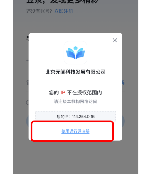 注意:如果出现“您的IP 不在授权范围内”,请点击下面的“使用通行码注册”