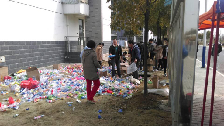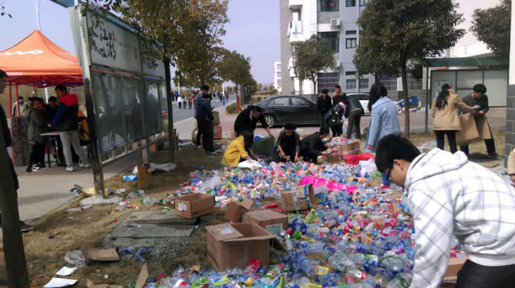 早上七点五十分,没有课的学生会成员就来到学生活动中心,帮忙搭支帐篷和布置场地等一系列事前准备活动。中午十二点,活动正式开始,参与此次活动的同学很多,都是拿着寝室的瓶子来登记或捐赠。不多时,风华园楼下便堆积了许多的瓶子,虽然经过一个寒假,许多瓶子都散发着难闻的气味,但学生会的成员依然挽起袖子,尽职尽责的整理着瓶子,将瓶身与瓶盖分开,经过了约三个小时的努力,场地基本被清理干净,大家带着一箱箱的“战果”回到活动中心的储藏室。