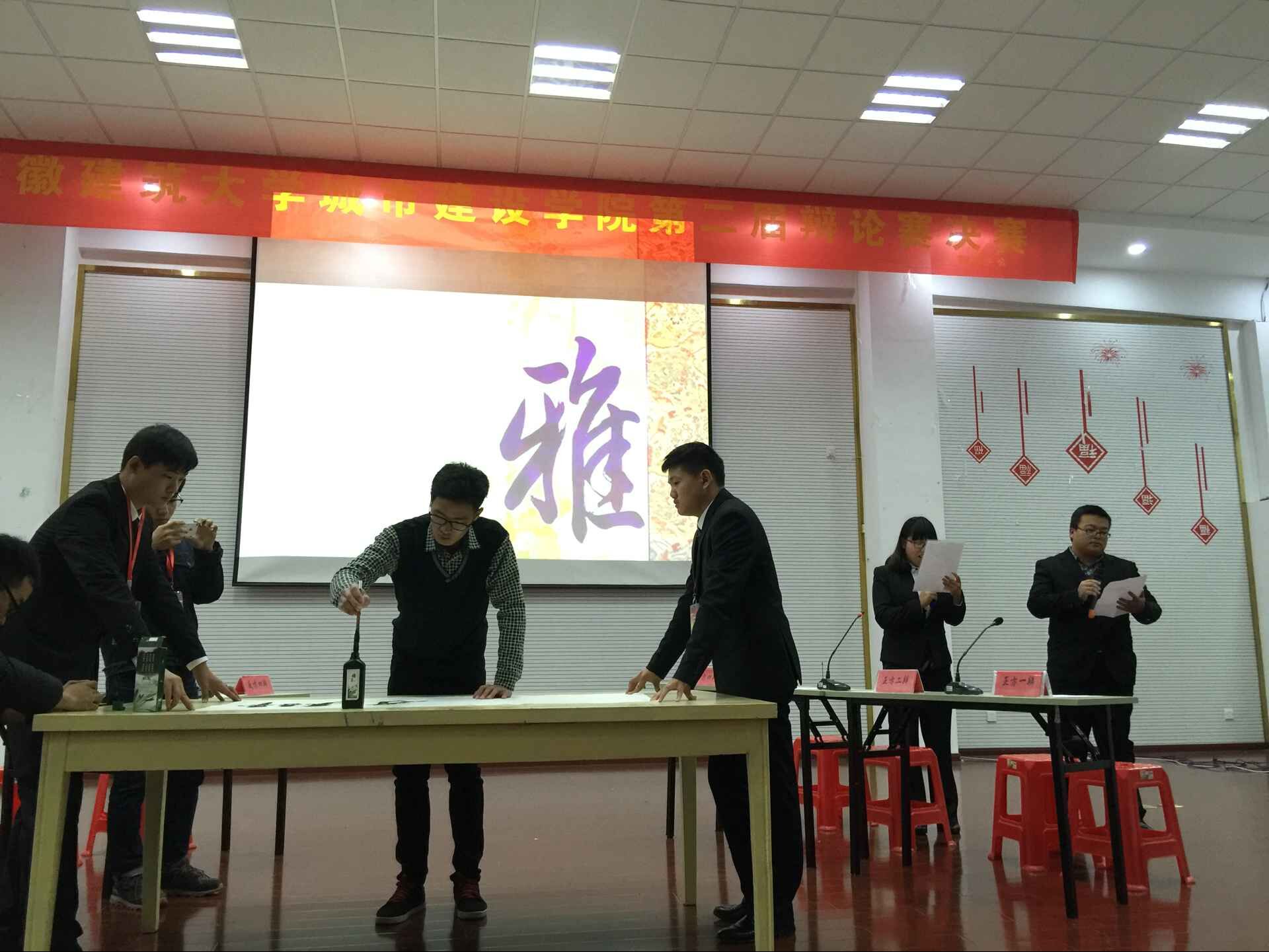 上半场首先击起战鼓的是正方15级智能一班代表队与反方的15级财管一班代表队,就“代沟的主要责任在于父母还是孩子”展开了激烈的辩驳。在比赛中,参赛双方都做了充分准备,并都能够遵守比赛规则,积极提问踊跃发言。比赛进行的十分激烈,掌声此起彼伏。让我们在高速发展的时代领悟到了缓解甚至消除代沟的方法。紧接着15级建艺系代表队与14级水务二班代表队就“寻找伴侣,找一个你爱的人更重要还是爱你的人更重要”展开了较量。正反方一辩迅速将全场温度点燃;自由辩论环节,双方紧紧抓住对方陈述词的不足紧追猛打;自由辩双方你来我往,正方建艺系代表队二辩抓住了对方辩手观点的漏洞,见缝插针,从漏洞中来展开强而有力的攻击言辞犀利,又是一番唇枪舌战。为了缓解紧张严肃的气氛,书法社在中场休息期间为大家带来了精彩的书法展示。