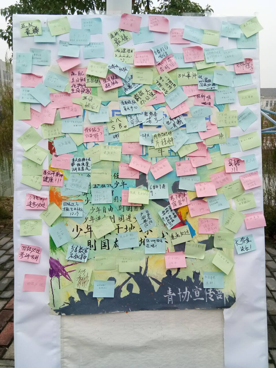 青协的志愿者们在上午十点的时候就早早进行一系列的活动准备,在自己的岗位上整装齐发。搬桌子,搭帐篷,挂会期等等,有条不紊的迅速完成。十点半活动准时开始。此次活动主要以国际学生日为核心,以横幅签名和写寄语的方式进行。活动现场热闹非凡,志愿者们生动幽默的向同学们介绍国际学生日的由来。此次活动同样得到了领导和老师的大力支持,皆在在横幅上签上了自己的名字。大学生们拿起手中的笔用心写下自己对未来的期望与对世界的祝福,贴到展板上,似乎梦想已经从这点燃。