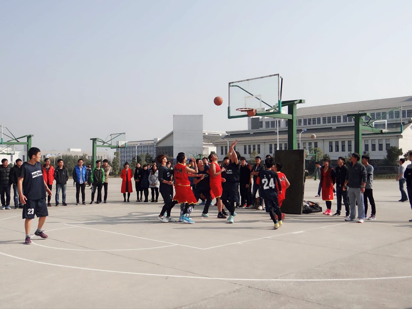 比赛还未开始,篮球场周围就围满了前来观看比赛的同学。首先由主持人介绍双方球队的成员,队员们个个热情高涨,跃跃欲试。紧接着,激烈的篮球赛开始了,现场的气氛急剧攀升。现场的同学们也在为他们所支持的球队加油助威,比赛双方越来越有激情,每位队员都在为自己的球队拼尽全力。上半场以极其接近的比分结束了。