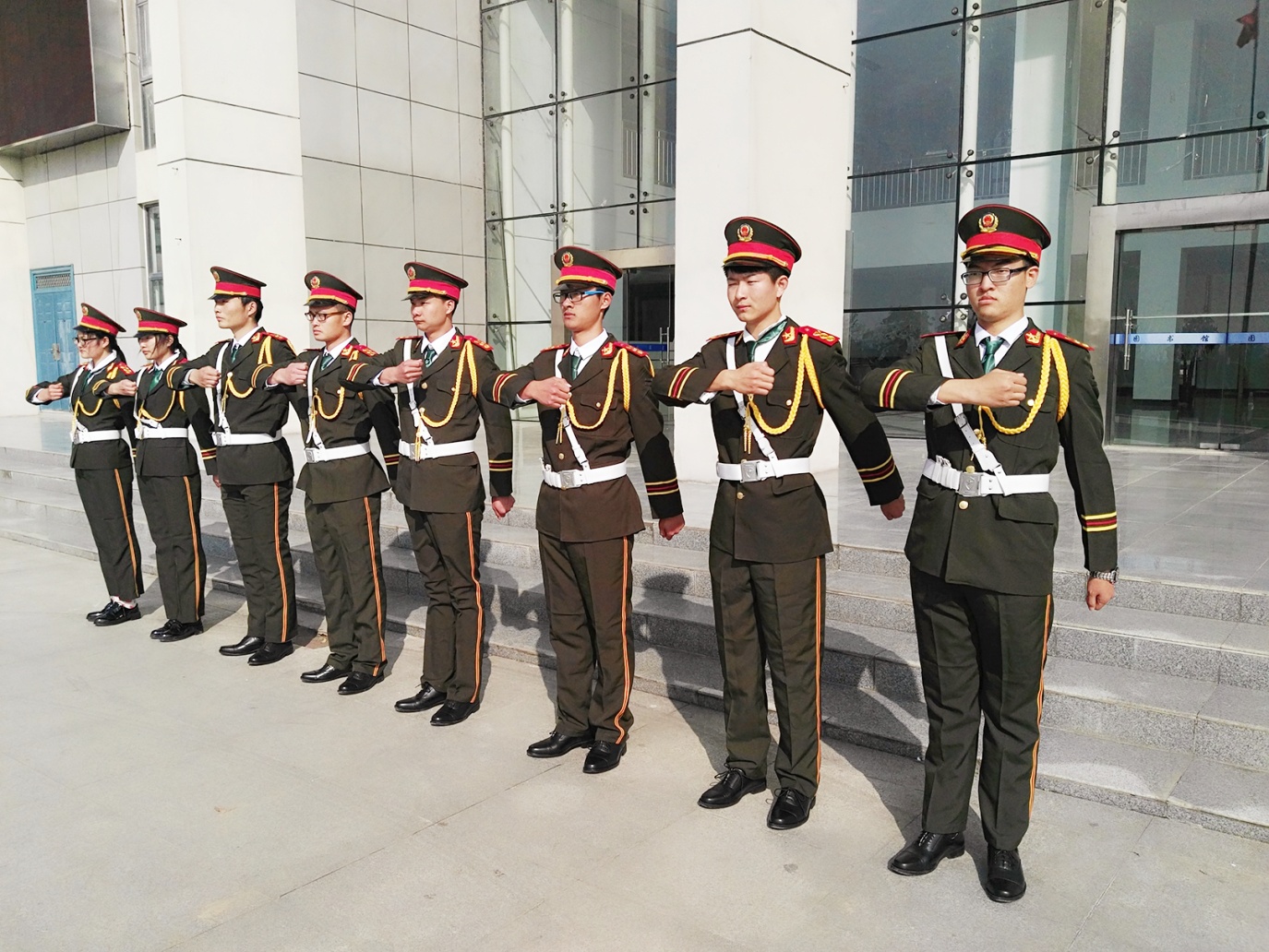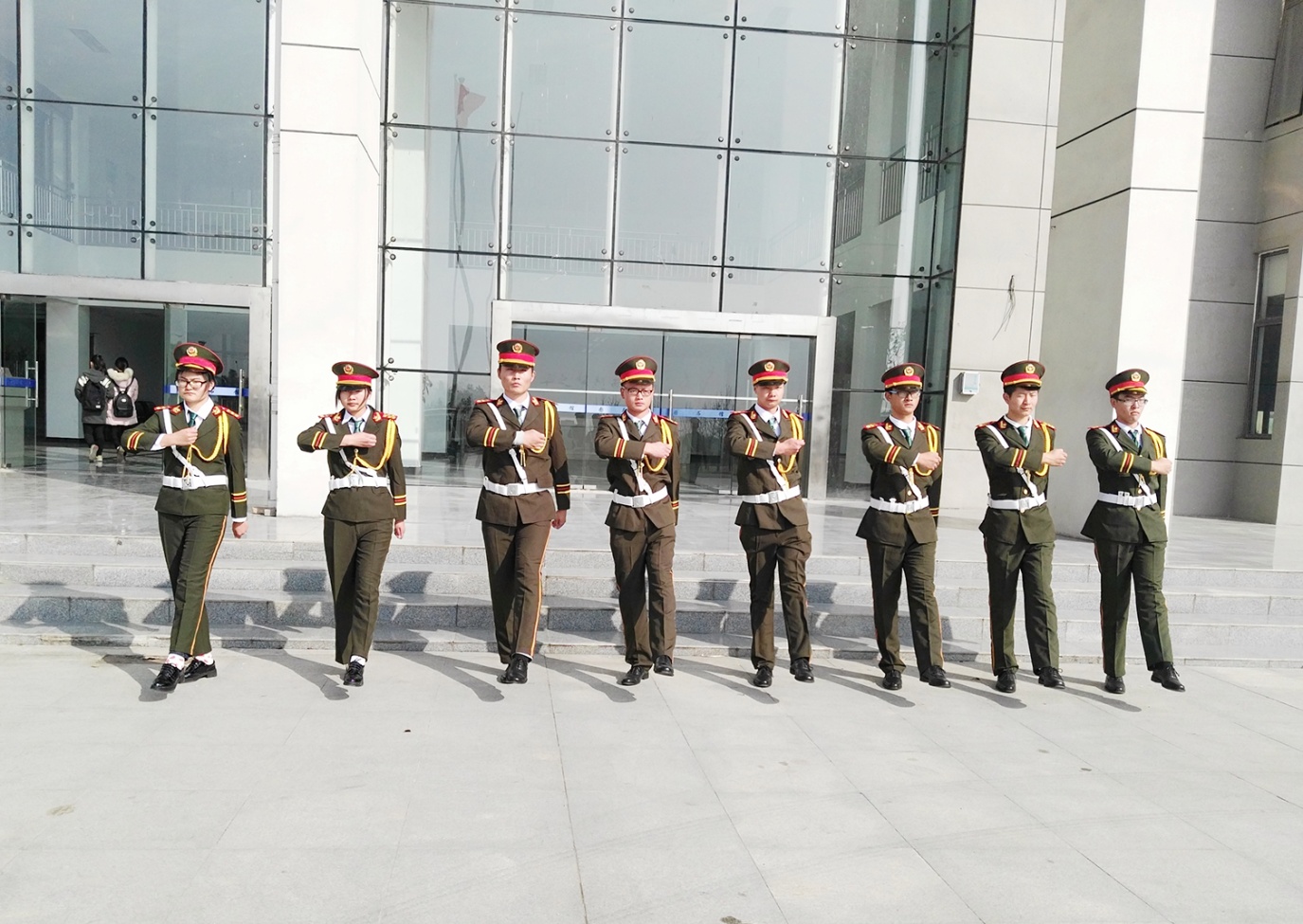 在班长袁俊的带领下,国旗班的小伙子和姑娘们认真训练每一个动作,立正、稍息、看齐、齐步走、正步走,还有最难的分列式。虽然中午的太阳非常的刺眼,但他们每个人依旧精神饱满、口号响亮,步伐整齐,在班长的指导下,力求做好每一个动作,不管是摆臂还是跨步,都严格要求自己做到位。而他们也以统一的服装、笔直的身形、坚定的眼神构成了图书馆门前一道亮丽的风景线。