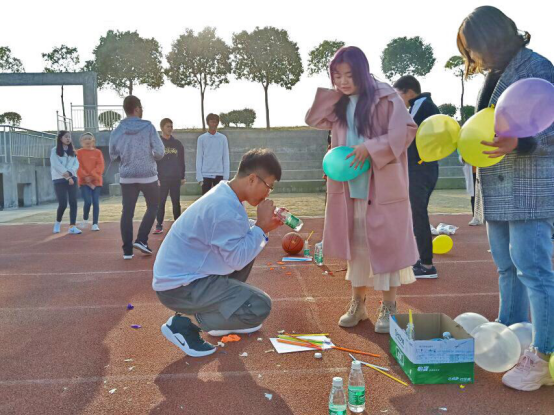 上午在食堂对面举行的是“感恩一路有你,小小礼物献给你”活动。同学们用简短精练的话语表达了他们的感恩,或许是感恩父母的养育之恩;或许是感恩老师的耳提面命;或许是感恩朋友的雪中送炭。下午到了感恩节活动的高潮部分“感恩一路有你,此生缘来是你”,此活动由"情丝连心绳”,“心心共球”,“感恩的心砰砰砰”三小部分组成。工作人员先进行了示范,比赛过程中,参赛选手两两一队,依次进行的是女女组,男女组和男男组。首先,参赛选手两人三足走或跑100米。然后,背靠背把篮球放在背部中间并运送到指定位置。最后,合作喝完一瓶水,挤爆三个气球,双方击掌以示完成比赛。参赛选手们由刚开始的不熟悉,到在比赛中的慢慢磨合,逐渐增加彼此的默契。现场气氛轻松愉快,参赛选手们使出浑身解数来增加自己的前进速度,现场一片欢声笑语,带动了工作人员也加入游戏中。