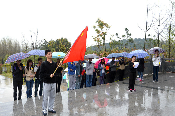 在烈士纪念碑前,学生会代表向烈士献上黄色雏菊,大家共同低头向烈士默哀一分钟,以示对烈士最崇高的敬意,随后同学们进行宣誓。活动结束,同学们又怀着对于烈士们的怀念和崇敬之情一一参观了烈士墓。临走前,学生会成员在纪念碑前合影留念,记录此次扫墓活动的点滴。