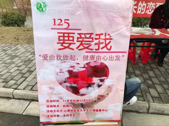 安徽建筑大学城市建设学院“要爱我”心理健康宣传活动自此结束。虽然活动过程只有那么短短的几个小时,虽然我们的问题还不能一一除尽,但是只要我们有一点点改变,一点点提高,那么这就是一个良好的开始,我们借此来走向更为美好的明天,你看,那红色的飘荡着的条幅上写着 :我谈过最长的恋爱,就是自恋,我爱自己,没有情敌。不管怎样,爱自己,都是终身浪漫的开始。爱自己才能更好地爱他人。