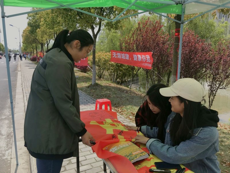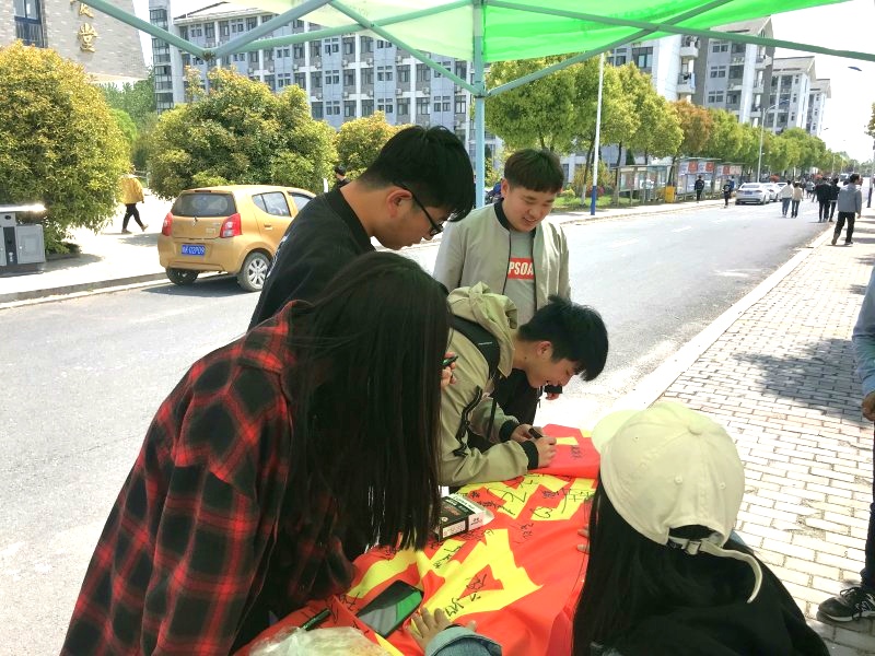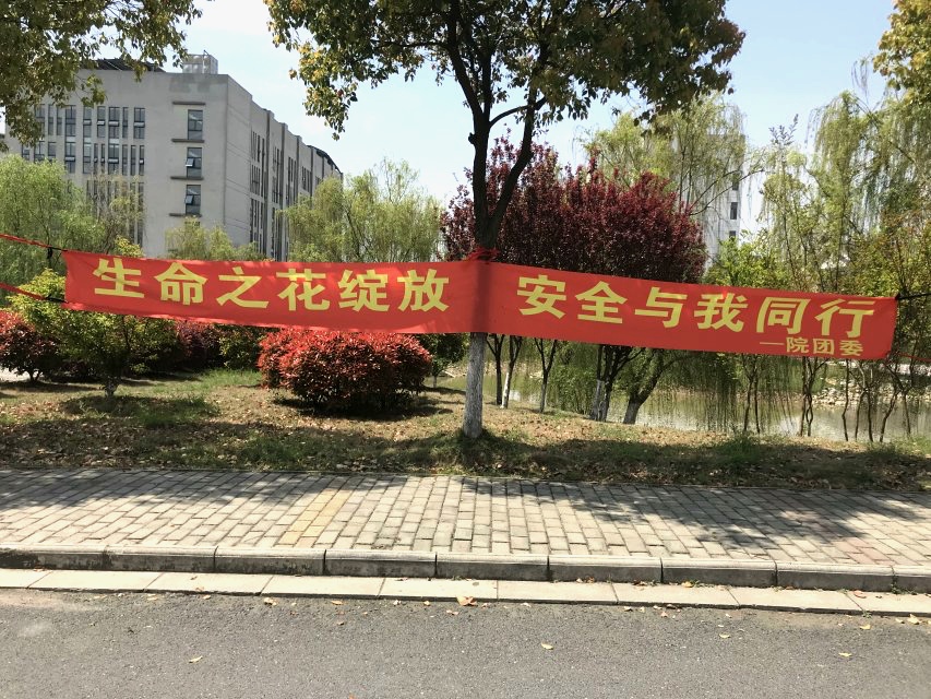 活动当天,暖风拂柳,绿意渐浓,安建大城建学院学生会纪律部早早的便来到了食堂对面的主干道,搭帐篷,架长桌,在长桌上将印有“安全伴我行”的横幅展开,准备好马克笔,以供到来的学生签名。