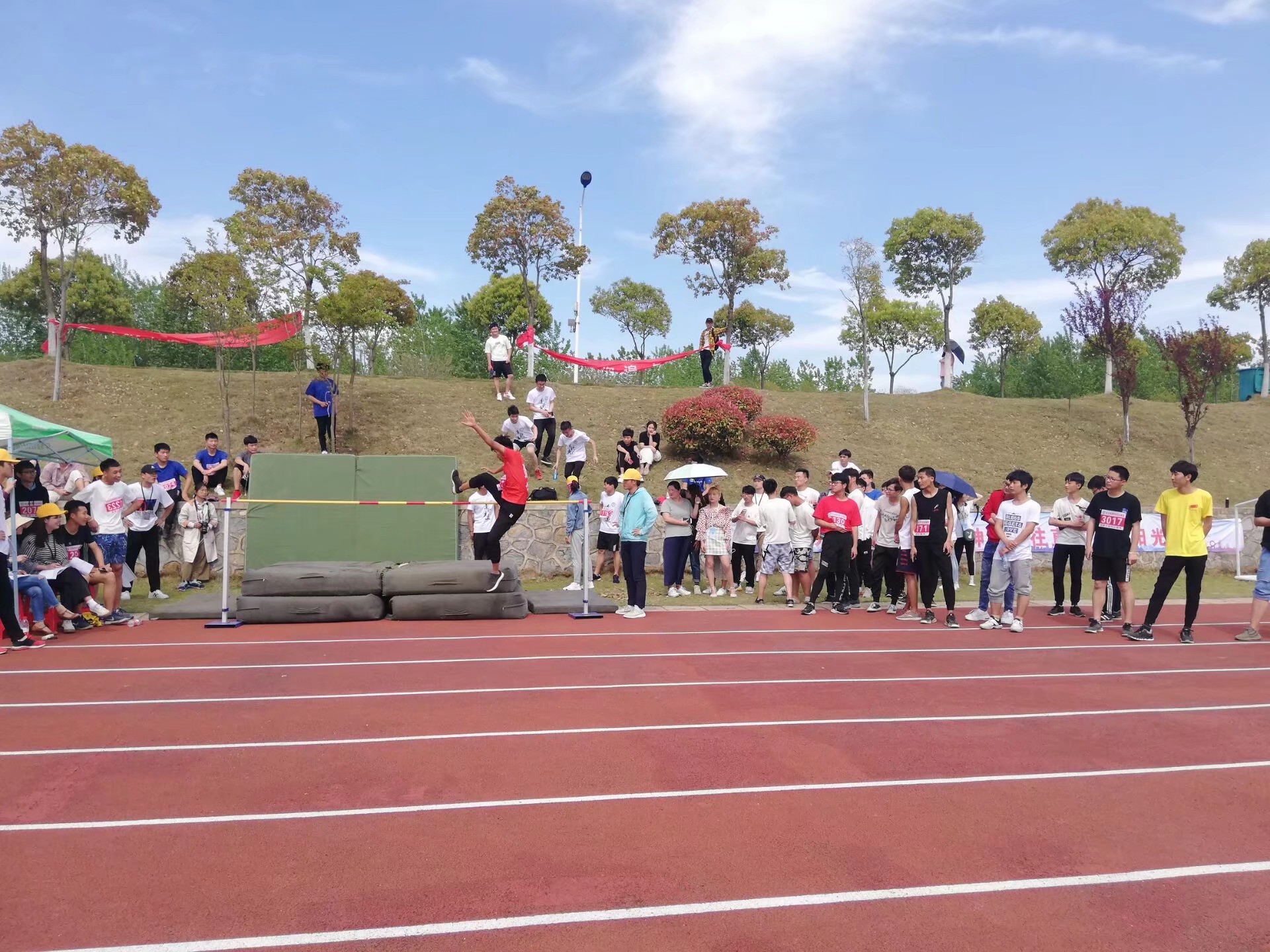 在阳光的照耀下,跳高比赛的赛场上格外辉煌,运动健儿们,用矫健的身躯冲刺着一个个的高度。来自17建筑学的胡涛同学在跳高比赛中获得了第二名的成绩,在助跑之后,一跃,身体在空中划出一道优美的曲线,连贯的动作看的观众叹为观止。