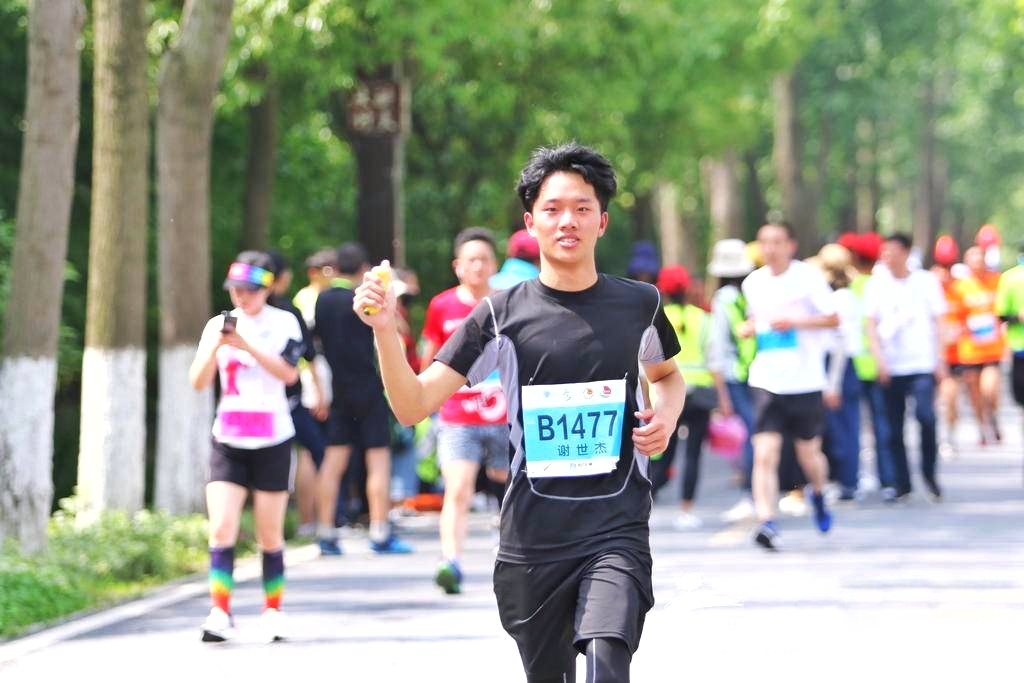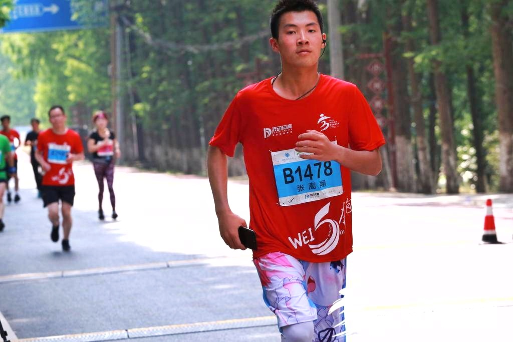 八点准时开跑,前半程空中的柳絮让选手不胜烦扰,而赛道中途最让跑协三人难熬的便是8km后的大坝地段,持续三四个公里太阳暴晒无遮蔽处。当时温度逼近27度,许多人在这里出现了中暑脱水等体力不支等情况,但是跑协三人带着信念坚持了下来。在每一个呼吸困难,脚底板发热发麻的瓶颈期,都是超越自我的瞬间。