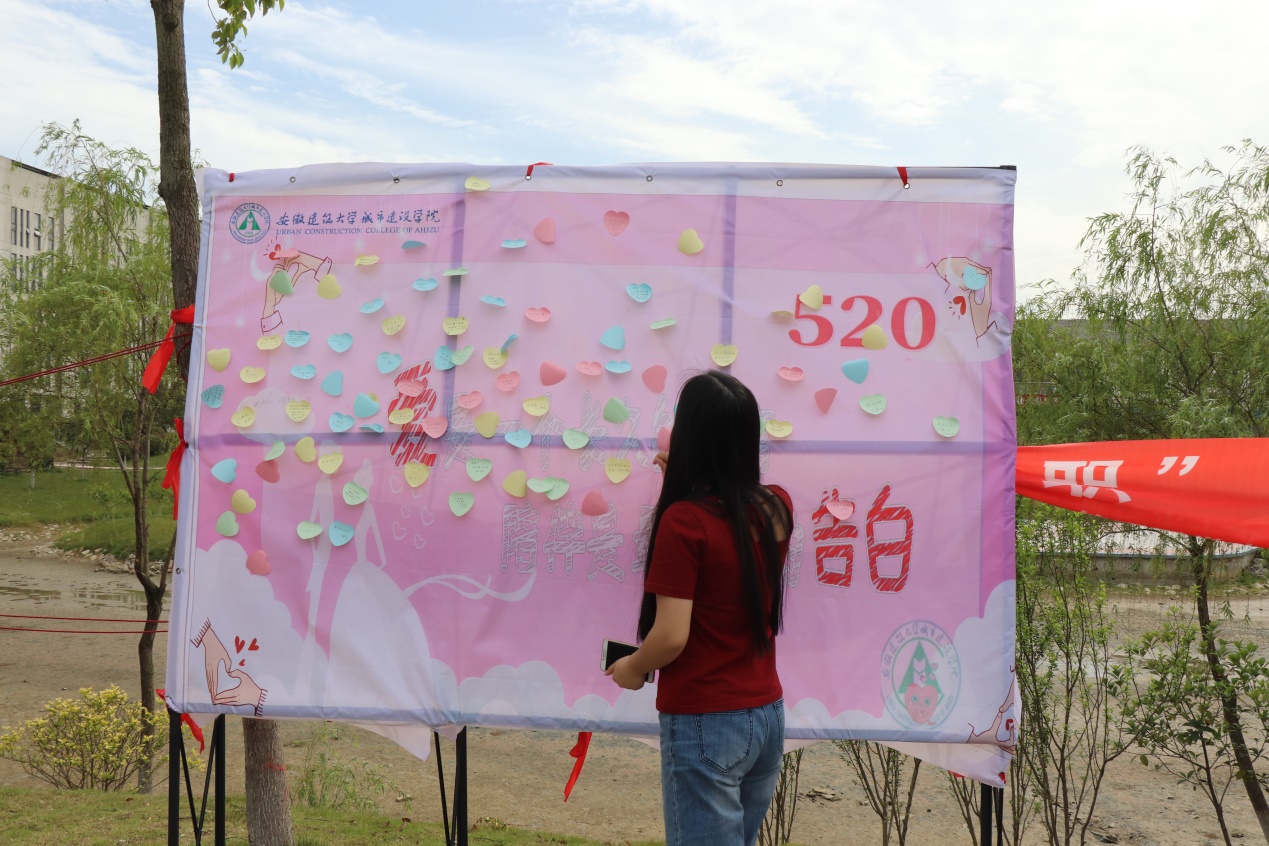 2019年5月20日,安徽建筑大学城市建设学院在校园主干道食堂对面举办“520—爱告白”表白墙活动。此次活动目的在于促进校园文化发展,丰富校园文化内涵,为星空在线注册(中国)官方网站-注册登录里的单身们提供一个展示自我,寻找另一半的机会,通过短短的话语,短短的信件加强,师生间,同学间的联系与情感,从而促进校园的和谐发展。