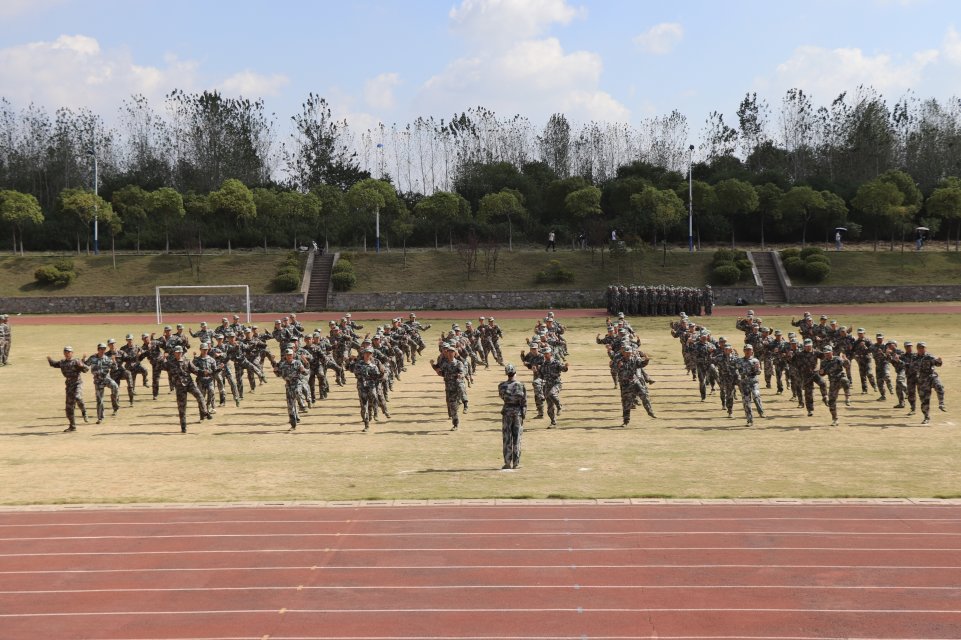 主席台旁的国旗手身着军装,在全体学生的奏唱下,缓缓将五星红旗升至城建上空。礼毕后由董事长宣布分列式及汇报表演正式开始。一列列军训方队,迈着整齐划一的步伐,走过主席台,接受领导的检阅,他们褪去了初来城建的青涩,眼神中满是坚定和自信,展现了属于城建人的雄姿英发,由内而外的散发着军人的浩然正气。随后2019级新生们带来了女子和男子的军体拳表演。女子军体拳巾帼不让须眉,一次次的挥拳,踢脚,夺枪都是力道均匀,节奏分明。男子也不甘示弱,口号短促洪亮,力道刚劲有力,是阳刚坚毅的少年儿郎。
