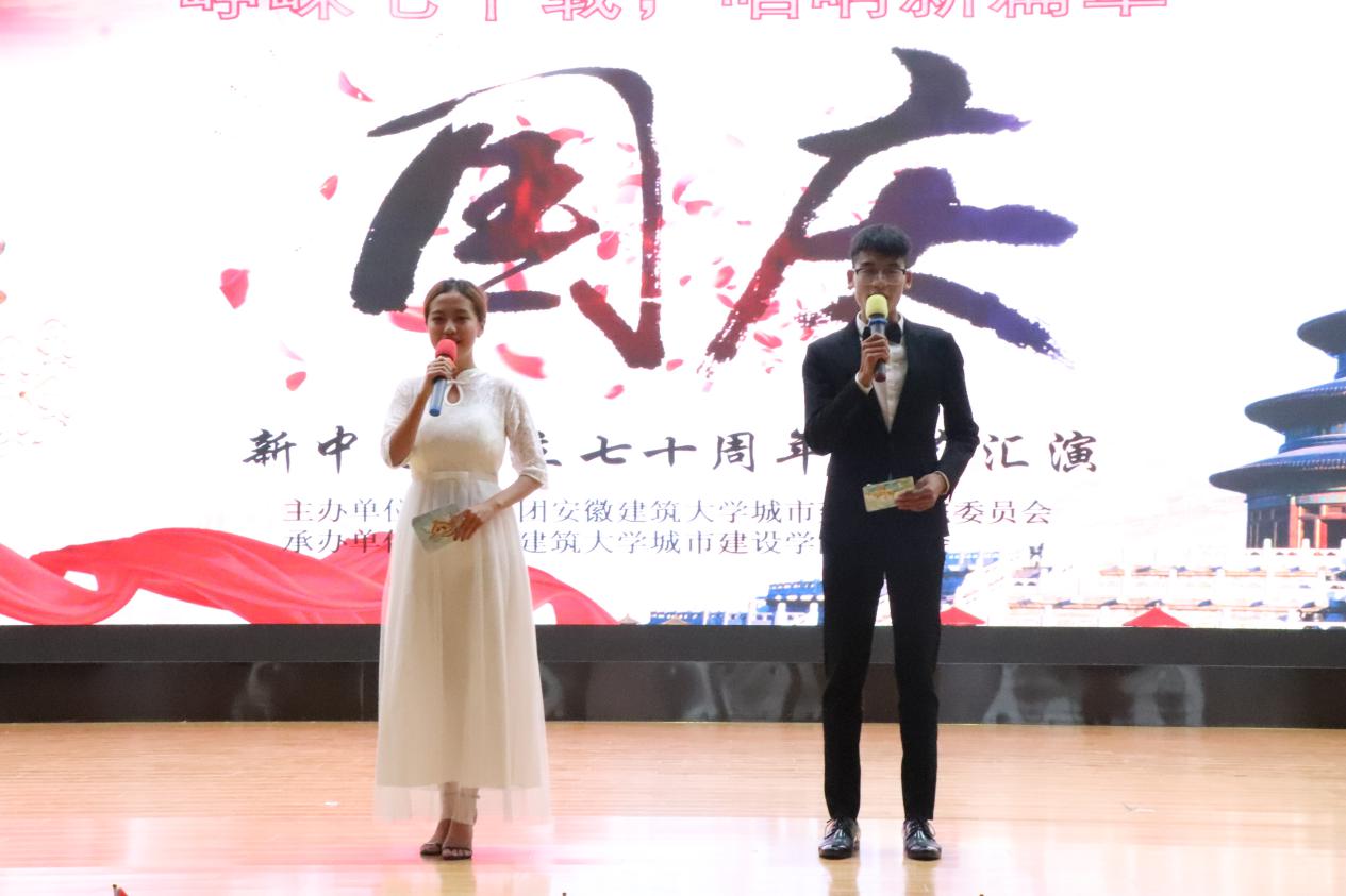 七十周年披荆斩棘,七十周年风雨兼程,在走过这半个多世纪的光辉历程后,新中国终于迎来了它的七十岁生日,为庆祝中华人民共和国成立七十周年华诞,2019年9月26日下午五点,安徽建筑大学城市建设学院特地在图书馆二楼大礼堂举办“峥嵘七十载,唱响新篇章”的文艺汇演活动。院团委书记王利康,院团委老师何晶,院学生会秘书长胡怡凡老师受邀出席了本次文艺汇演。