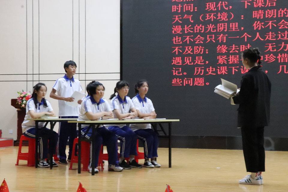 及肩的长发,手拿圆扇半遮面,身穿交领的红白色长袖襦裙,在舞台上,一个神态一个动作皆是万般风情,细碎的舞步,飞扬的裙摆,传神的眉目,动人的姿态。一曲古风被演绎的轻灵曼妙,使人沉醉。柔后便是刚,一幕幕话剧的呈现,无论是扮演学生亦或是老师,都能感受到这些19级新生的热情;一个个军体表演的展示,那些迷彩的身影,挺拔伫立,仿佛在等出征的号角打响,同学们甚至可以看见想象到数年前硝烟弥漫的战场上,鲜红的回忆;一句句洪亮的声音,着装整齐的男女生合唱,共筑中华人民的新篇章。话剧、军体拳和合唱中寄托着浓浓的缅怀历史的情思。白色象征着庄重,黑色象征着沉稳,同学们的声音整齐嘹亮,铿锵有力,谱写中国的复兴梦,朗诵中寄托的中国梦激励着学子们为了中华民族伟大复兴不断地努力学习奋斗。