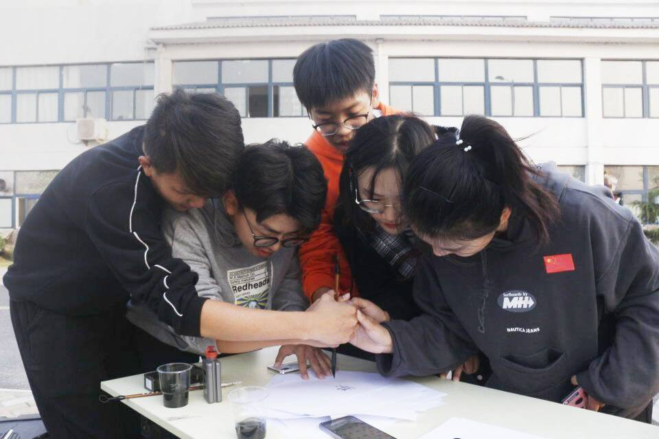 活动正式开始,参赛的人员穿着休闲宽松的运动服,身上带着画有自己团队标志的布条,每个人脸上都贴着一面鲜艳的五星红旗,他们神情饱满、热情奔放,加油声、欢呼声、笑语声此起彼伏,散发着青春的活力。首先映入眼帘的是第一站近代史知识竞答,参赛选手随机抽取关于中国近代史的题目进行回答,他们学识渊博,回答问题得心应手。一转眼,巧读绕口令站点也围绕着许多参赛选手,每个队伍需派出两名队员在规定的时间内大声朗读白板上的绕口令,如果失败,就要接受被泼彩虹粉的惩罚。他们面露痛苦的表情,原来是听红歌接歌词失败了,正在接受喝特殊饮品的惩罚,看着他们深深皱起的眉头,也让人忍俊不禁。接着,他们共同拿着纤长的毛笔在纸上进行汉字仿写,描写完成即可进入下一站点比赛。最后一项是巧扫二维码,即派出一名选手用下腰的方式扫描公众号的二维码,扫描完成即算成功,最后到达终点即可。用时最短的队伍里,每个人都可获得一枚奖牌。活动转眼间已接近尾声,每个队伍都在图书馆门口进行合影留念,记录下这美好的一刻。