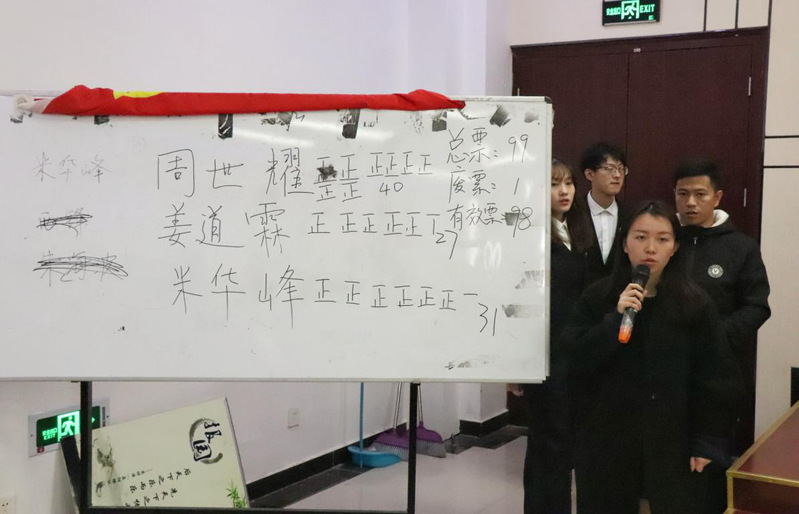 之后,由程梦楠主席宣读第二届学代会委员会委员选举办法,并介绍了各位候选人情况。经学生代表投票后,由院团委何晶老师监督计票。接着,程梦楠主席宣读了第三届学生会秘书长选举办法并介绍候选人情况,此后继续宣读了第三届学生会主席团选举办法并介绍了各候选人情况。在学生代表严谨投票后,经院团委伍红平老师计票后,由院团委何晶老师宣读了最后的选举结果:胡怡凡,黄芳雨,谢俊超,徐佳宾,刘苗苗,周世耀六人当选学代会委员会委员,胡怡凡担任第三届学生会秘书长,任黄芳雨为学生会主席,谢俊超、徐佳宾、刘苗苗、周世耀为副主席,与会成员向他们表示了热烈的祝贺。