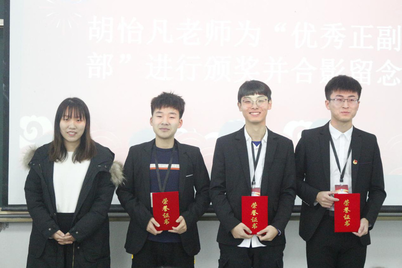 大会行进过半,学生会主席黄芳雨宣读2019-2020学年第一学期学生会“优秀部门”、“优秀正副部”、“优秀干事”名单。优秀部门代表纷纷上台,由何晶老师为其颁发证书并合影留念。紧接着,胡怡凡老师为“优秀正副部”进行颁奖并合影留念。随后学生会主席团代表徐佳宾,,周世耀共同为“优秀干事”进行颁奖并合影留念。不管烈日还是酷暑,不管疾风还是骤雨,不管崎岖还是坎坷,他们都一如既往。学生会之路从不平坦,他们却甘之若饴;奉献之路从不一帆风顺,他们却乐此不疲,志相知,愿相随,爱相伴,心相向。他们用实际行动诠释着“服务”二字。