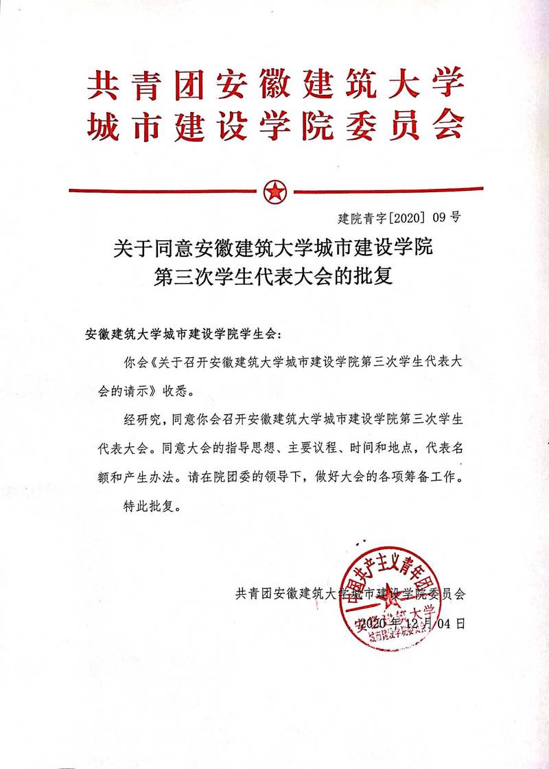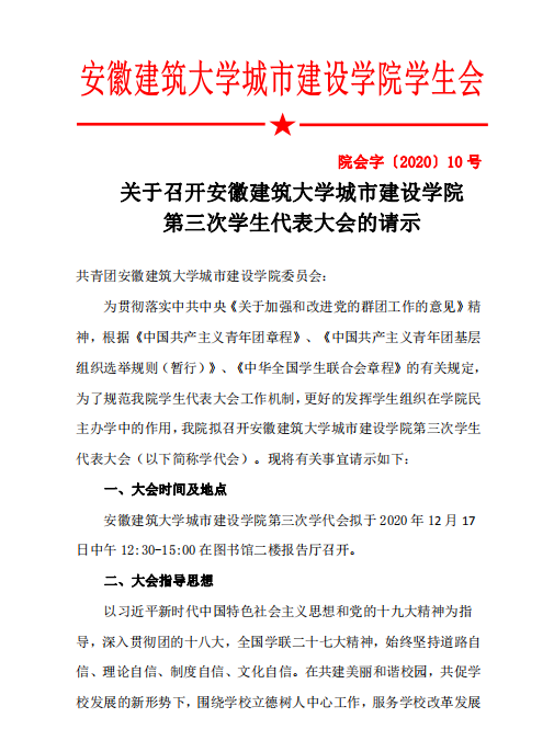 2019年11月21日我校召开了安徽建筑大学城市建设学院第二次学生代表大会,安徽建筑大学城市建设学院第三次学生代表大会定于2020年12月17日在黄麓校区报告厅召开。