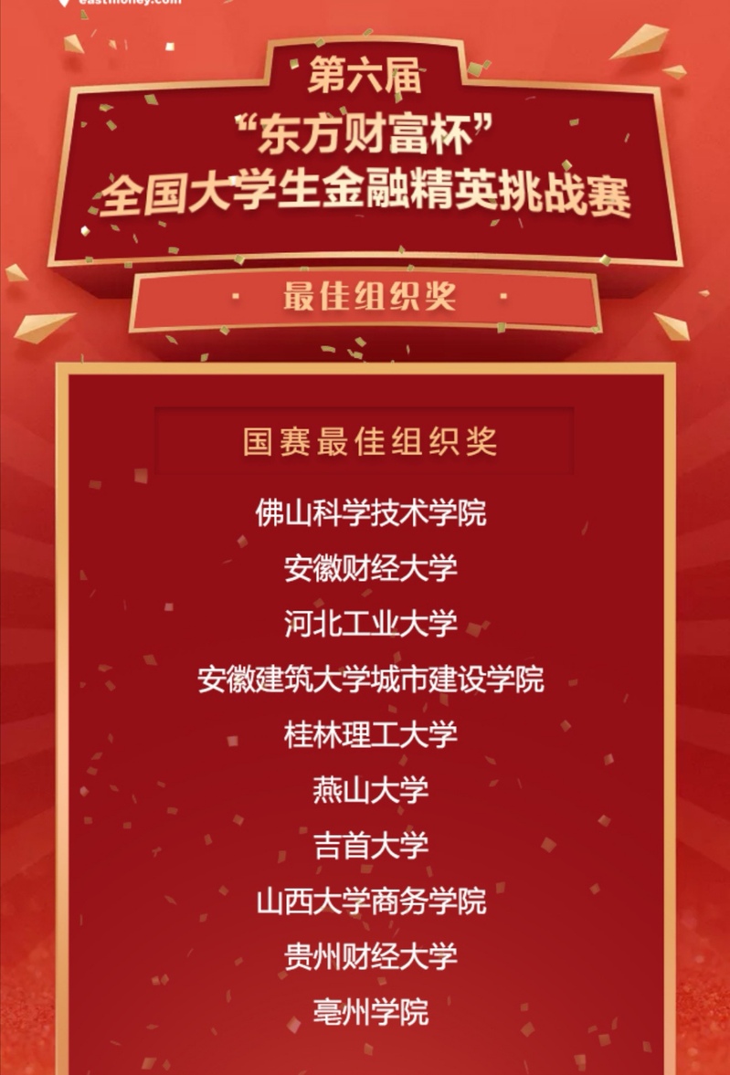 我校积极动员、组织学生参赛,参赛人数排名全国第三,安徽第二。根据评选规则最终我校陈芊等9支队伍获得国赛一等奖团队、我校谢宜蒲等29支队伍获得国赛二等奖、我校刘柳等32支队伍获得国赛三等奖,共计210人获奖,获奖规模再创新高。“东方财富杯”全国大学生金融精英挑战赛已成为面向全国大学生群体打造的具有高知名度、高含金量及社会广泛认可的金融创新实践大赛。