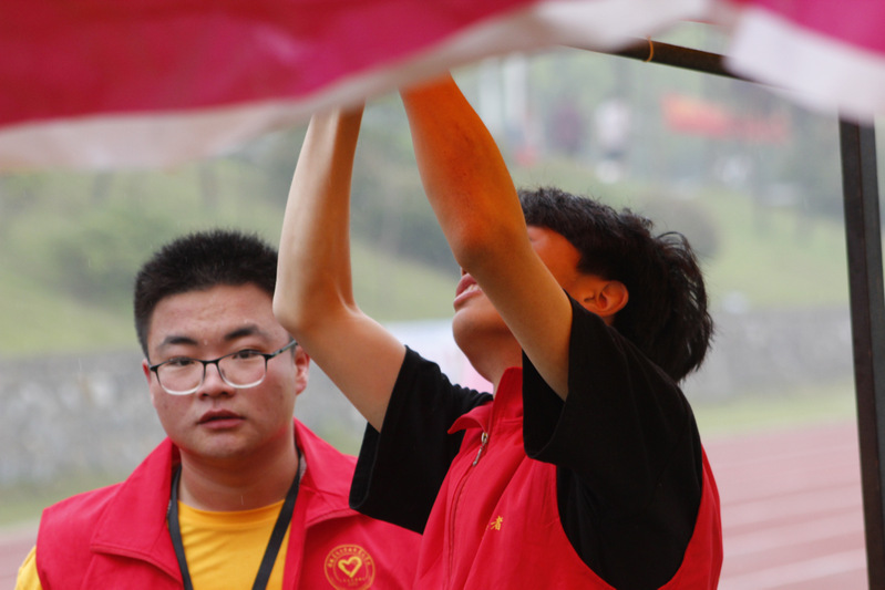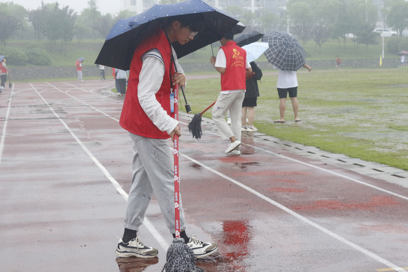 在运动场的各个角落你都会发现红衣马甲的身影,这是由院学生会、青年志愿者协会、社团联合会、大学生艺术团组成的运动会志愿者队伍。整个运动会期间,他们从始至终都坚守在自己的岗位上,未曾离开。他们的手里或是量跳远、铅球距离的尺子,或是记录时间的秒表,或是雨中暖胃的姜汤,或是挥动的小旗子,或是清理雨水的工具。在赛场上,志愿者的身影是一道亮丽的风景线。