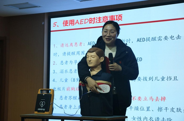 张老师详细讲授了心脏骤停的概念、急救行为的重要性、基础心肺复苏术的原理及操作方法。在让同学们了解急救知识与技术原理的基础上,张老师又重点讲解并演示了胸外心脏按压技术、人工呼吸方法和使用自动体外除颤器AED的动作要领。
