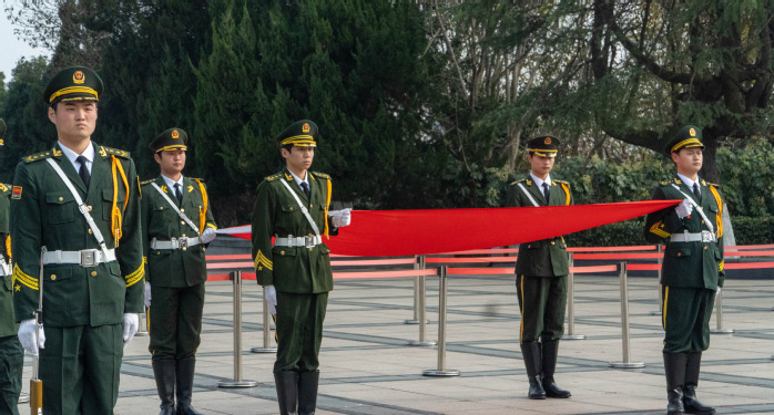 仪式开始,首先国旗护卫队在烈士陵园前进行展旗,他们挺拔的身躯,矫健的步伐,展现出青年的良好的精气神,为革命烈士们送上最真挚的敬意,进行缅怀仪式。