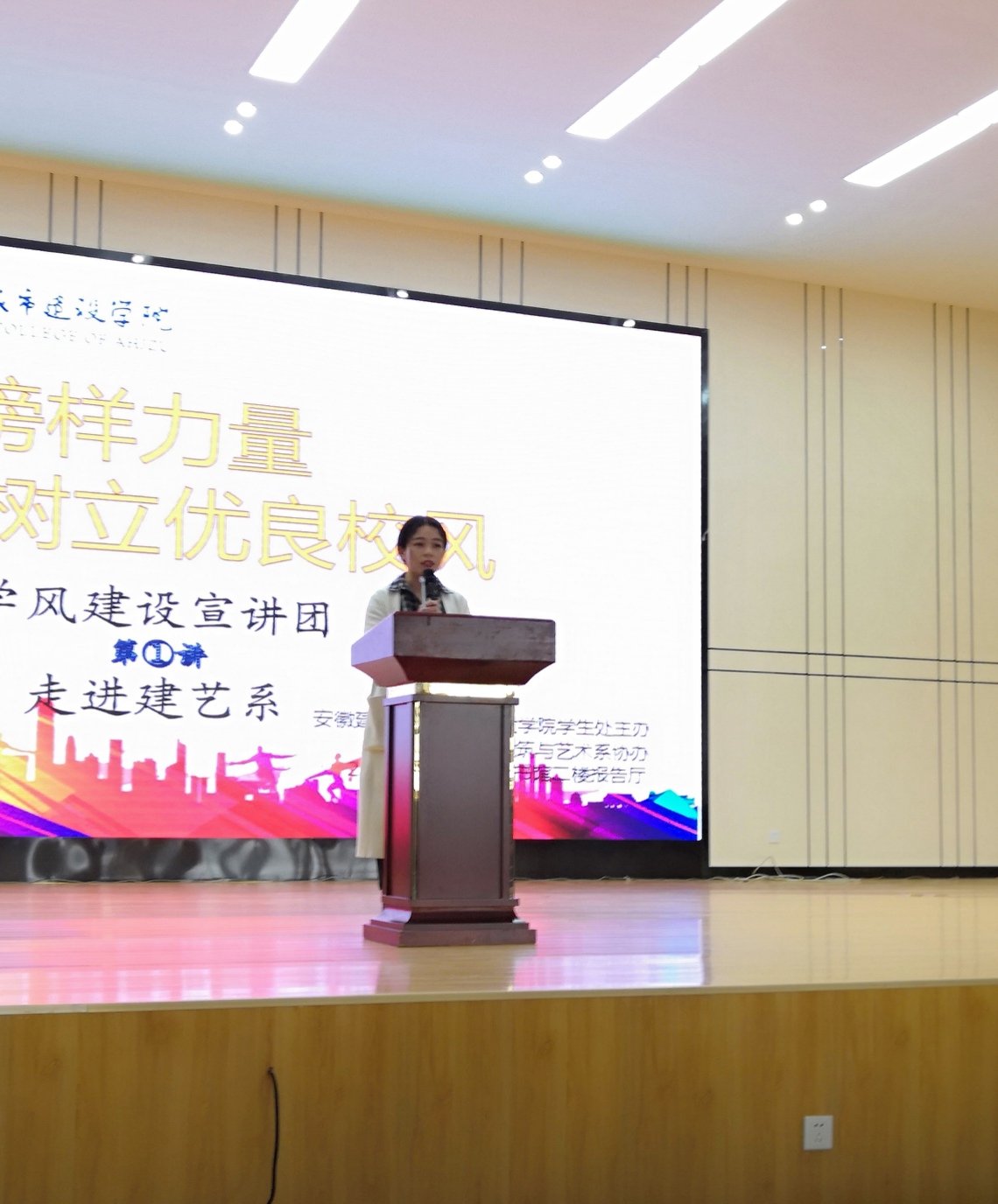 3月28日,安徽建筑大学城市建设学院“绽放榜样力量,树立优良校风”学风建设宣讲活动在图书馆二楼报告厅圆满举行,学生处、建筑艺术系老师,宣讲团成员、建筑艺术系学生参加了本次活动。5位同学为建艺系的学弟学妹们分享了他们的学习、生活经历,本场宣讲会由高宇老师主持。