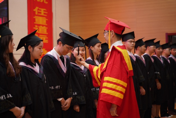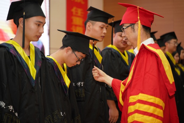 院长张伟林为毕业生扶正流苏。全体毕业生身着学院定制赠送学士服,头戴学士帽,依次走上台。张伟林为每一位毕业生扶正流苏,将老教育工作者的希冀与祝福传递给未来的祖国栋梁。毕业生们与与会领导或握手,或拥抱,在感谢学院的培养与关爱的同时,也将这庄严而肃穆的时刻铭记于心,永远定格。