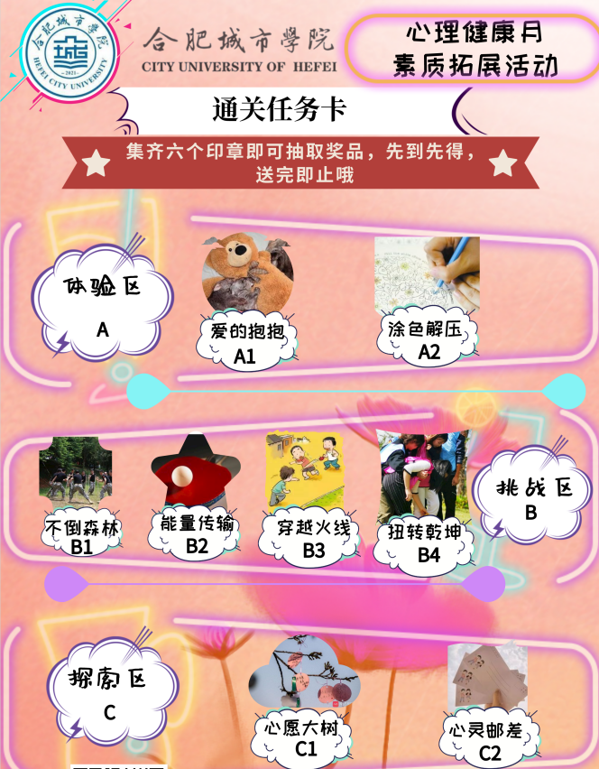 心理素质拓展活动共分为3个区,依次为体验区、挑战区、探索区,在每个区都有相应的主题游戏和活动。在体验区有爱的抱抱和涂色解压两个项目,旨在引导同学们注意到每个人都有爱与被爱的需求,能在他人需要帮助的时候给予善意。在挑战区有四个游戏项目,分别为不倒森林、能量传输、穿越火线以及扭转乾坤,这四个项目旨在帮助同学们明白团结协作的重要性,过程中同学们不仅体会到了乐趣,放松了身心,更增进了彼此之间的感情。在探索区设置了一些触动心灵的小游戏,比如有帮助同学们解答困惑的“答案之书”,还有承载同学们纯粹而又美好的祝福的“心愿大树”,以及帮助同学们诉说心底秘密的“心灵邮差”。