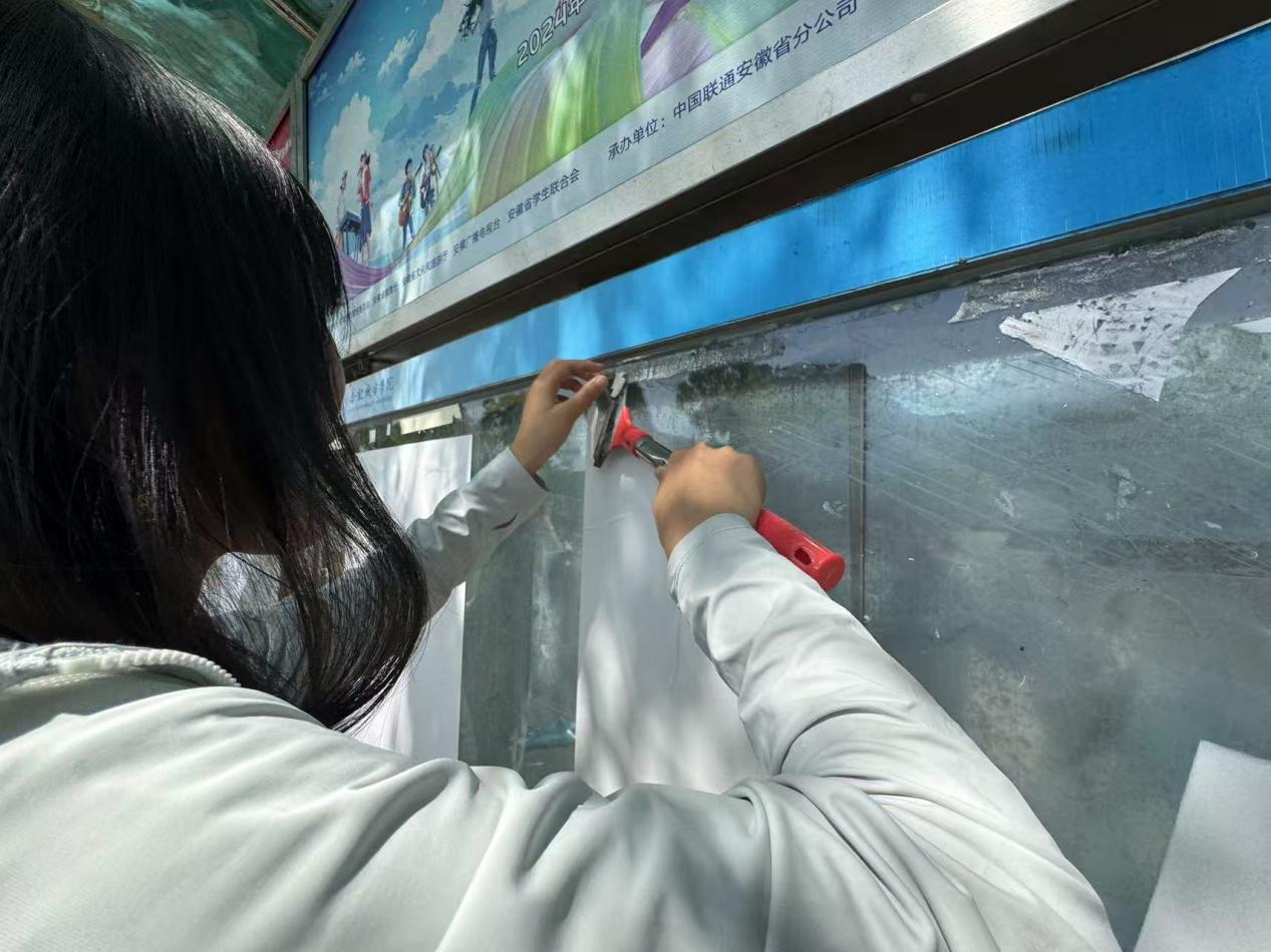 物管人员介绍,这些橱窗因常年张贴活动海报,积累的胶质层最厚处达3毫米,清洁难度远超预期。但学生们始终无人抱怨,反而自发研究工具改良,用废弃卡片自制"胶痕铲",展现了解决问题的创造力。