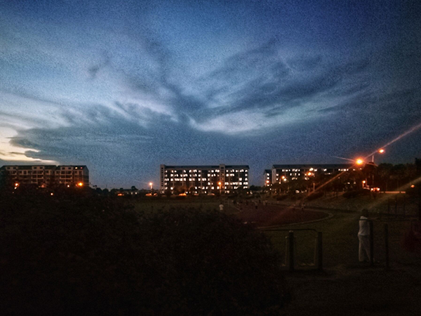 一盏亮黄黄的灯,时间在旁闷不吭声地逝去……唯有喧闹声打破了这宁静的气氛。回过神一看,原来是三五成群的同学们在球场拼搏。路灯照明下的他们在来回进攻防守,一会长传突进,一会贴身跟防,他们专心致志地在球场上厮杀,还有些同学们在风雨操场里挥舞着羽毛球拍或者是乒乓球拍,一个个矫健的身姿,一次次灵活地挥拍……一盏耀眼的路灯照出了城建人的矫健身姿,还有他们的追求、奋斗和努力。路灯之下,似乎也是世界的缩影,他将人们的梦想拉长,渐渐模糊在那汗渍渍的球场里,化作永恒的拼搏画卷。