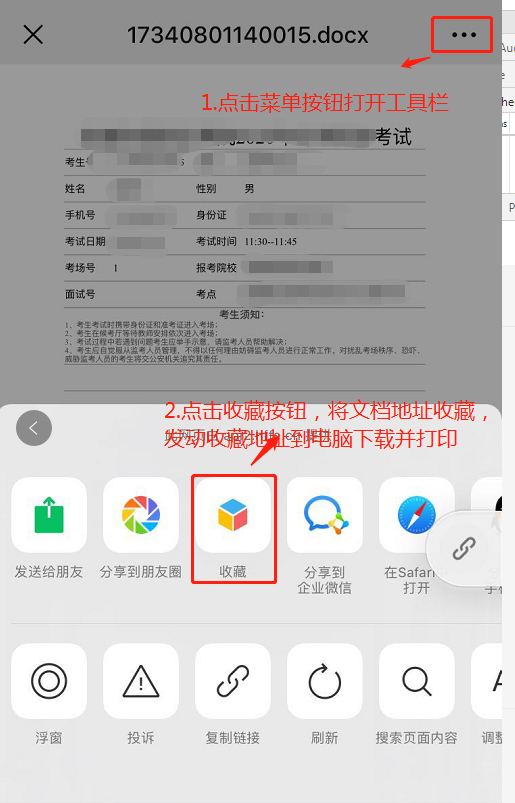 系统自动生成准考证文档(word),考生可以下载下来并打印,(注意:部分移动端会直接打开word文档,针对这种情况,考试可以在打开的word文档页面点击右上角的菜单按钮并收藏,找到打印机后把收藏的文档发送到打印机电脑端下载并打印)